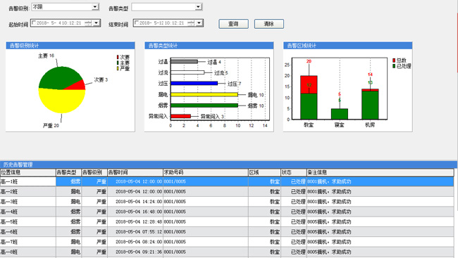 當(dāng)下各類傳感器已經(jīng)進(jìn)入我們的生活,很多環(huán)境的檢測(cè)告警都已通過(guò)傳感器實(shí)現(xiàn),申甌校園智控“云”系統(tǒng)融合了各類傳感器,如煙感、紅外、過(guò)壓、過(guò)流、過(guò)溫、漏電等等??刹渴鹪趯W(xué)校的教學(xué)樓、宿舍樓、機(jī)房等。一旦觸發(fā)告警,我們的告警平臺(tái)(下圖所示)會(huì)“自動(dòng)彈窗告警”,告警彈出窗口會(huì)顯示哪個(gè)時(shí)間、什么地點(diǎn)、發(fā)生了什么類型的告警,通過(guò)系統(tǒng)的多維度圖表分析,我們可分析告警的占比情況,如告警嚴(yán)重性等級(jí)、告警類型分類、告警地點(diǎn)。并且報(bào)警會(huì)觸發(fā)我們預(yù)先設(shè)置好的報(bào)警終端話機(jī),接聽后會(huì)自動(dòng)重復(fù)播報(bào)發(fā)生報(bào)警的地址位置。通過(guò)此系統(tǒng),我們能將預(yù)防做到前面、將危險(xiǎn)控制在萌芽階段。